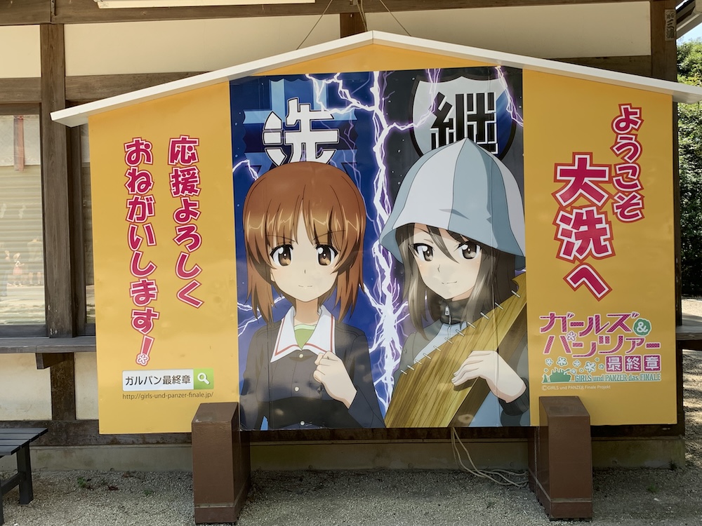 この町は「ガールズ&パンツアー」というアニメの舞台になっていて、神社の中にもキャラクターの看板が立っていたり、コラボした絵馬やお守りがあります。